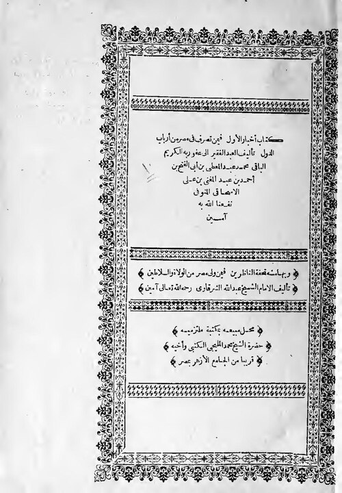 وسميته (لطائف أخبار الأول فيمن تصرف في مصر من أرباب الدول) وقد رأينا أن نقسم هذا الكتاب إلى مقدمة وعشرة أبواب وخاتمة ، المقدمة في فضائل مصر وذكرها في كتاب الله المبين وما ورد فيها من أحاديث سيد المرسلين ومن كان بها من الأنبياء والصديقين وغير ذلك على ما يأتي بيانه مفصلا إن شاء الله تعالى والله أسأل أن يحسن بختامه كالأول ، الباب الأول في خلافة الخلفاء الأربعة ومن ولي بعدهم وهو الحسن بن علي بن أبي طالب ، الباب الثاني في دولة بني أمية ، الباب الثالث في الدولة العباسية ، الباب الرابع فيمن ولي مصر من نواب الخلفاء الراشدين وبني أمية والعباسية وما داخلها من تغلب بني طولون والإخشيدية.