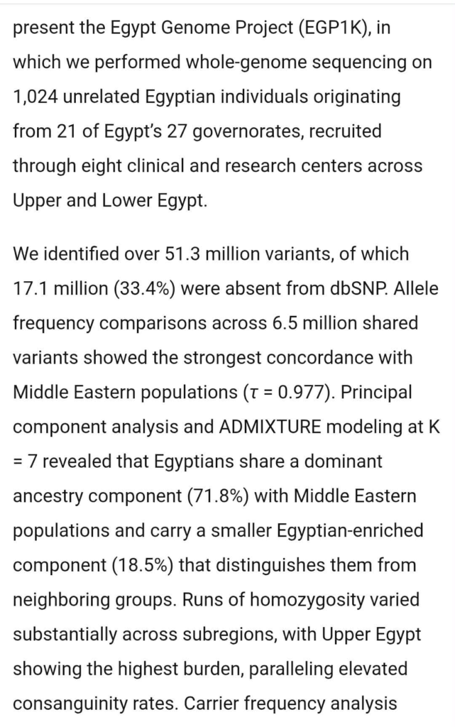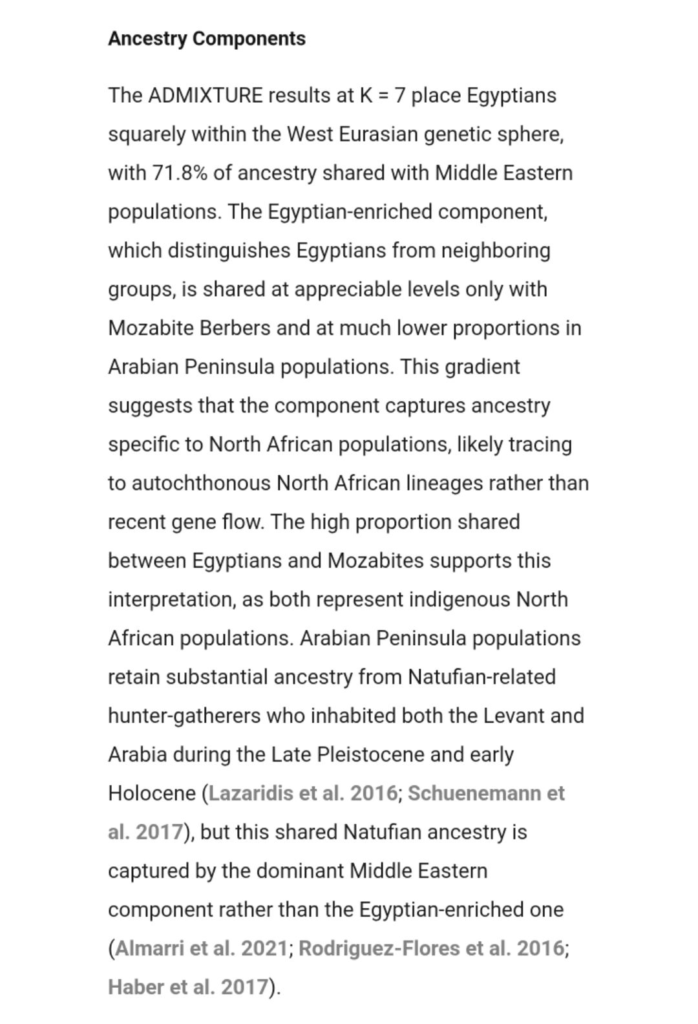 وذكرت وقتها أن نسبة السلالة الأفريقية الفرعية EM78 (تنتشر في وادي النيل والسودان والقرن الأفريقي وتحوراتها الفرعية V22/V12) تشكل نسبة 18 % وليست أغلبية في مصر كما يدعي الهواة وأنصاف المتعلمين والشعوبيون الجدد ، وقد أظهرت نتيجة مشروع الجينوم المصري حاليا أن نسبة الجينات المعزولة وغير المشتركة مع الوطن العربي تشكل فقط نسبة 18 % وأن ذلك راجع إلى مكون سلالي قديم من عصور ما قبل التاريخ.